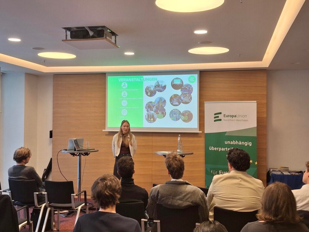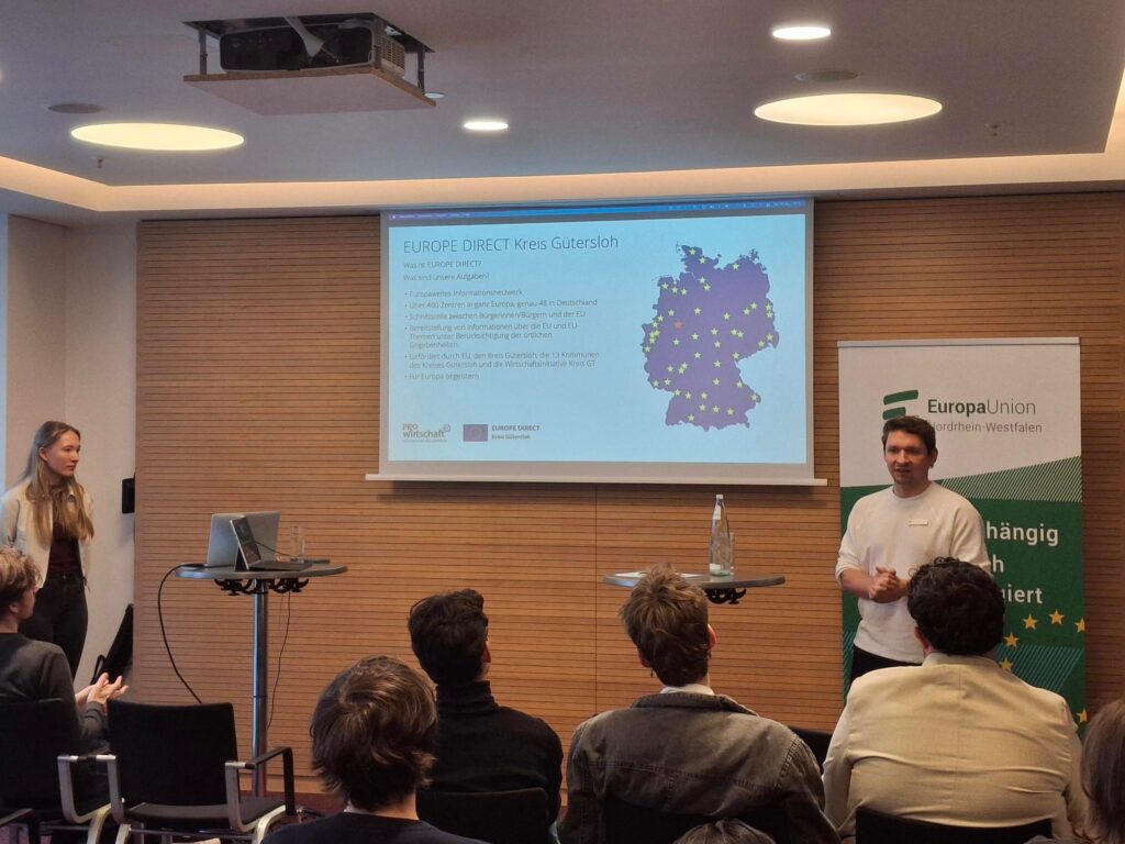 Zunächst stellte sich neben der JEF NRW auch das EUROPE DIRECT Gütersloh vor. Leiter Rouven-Mathis Piesch informierte über die Arbeit der EU-Informationsstelle vor Ort in Gütersloh und die Möglichkeiten, mehr über die EU zu erfahren.